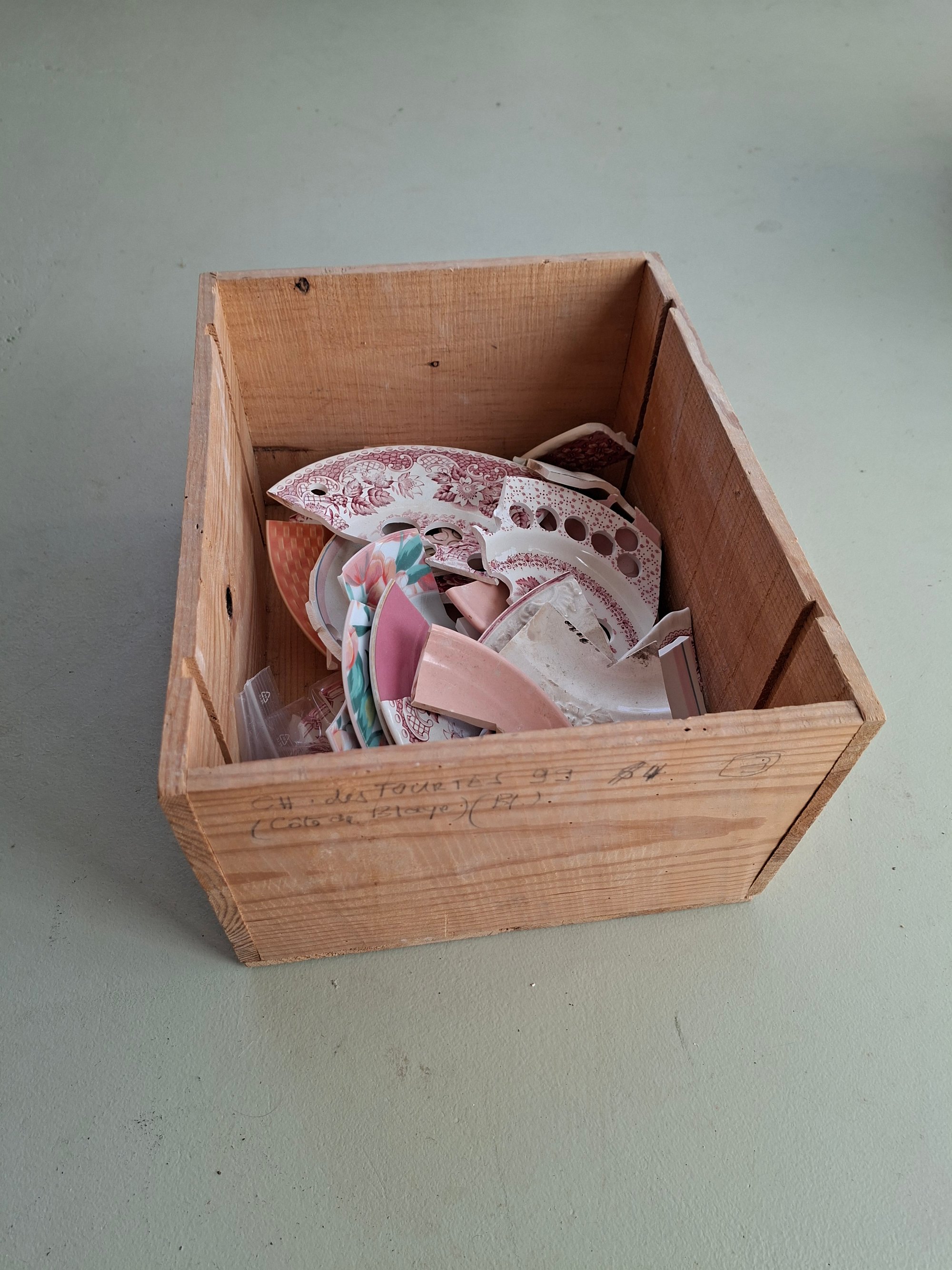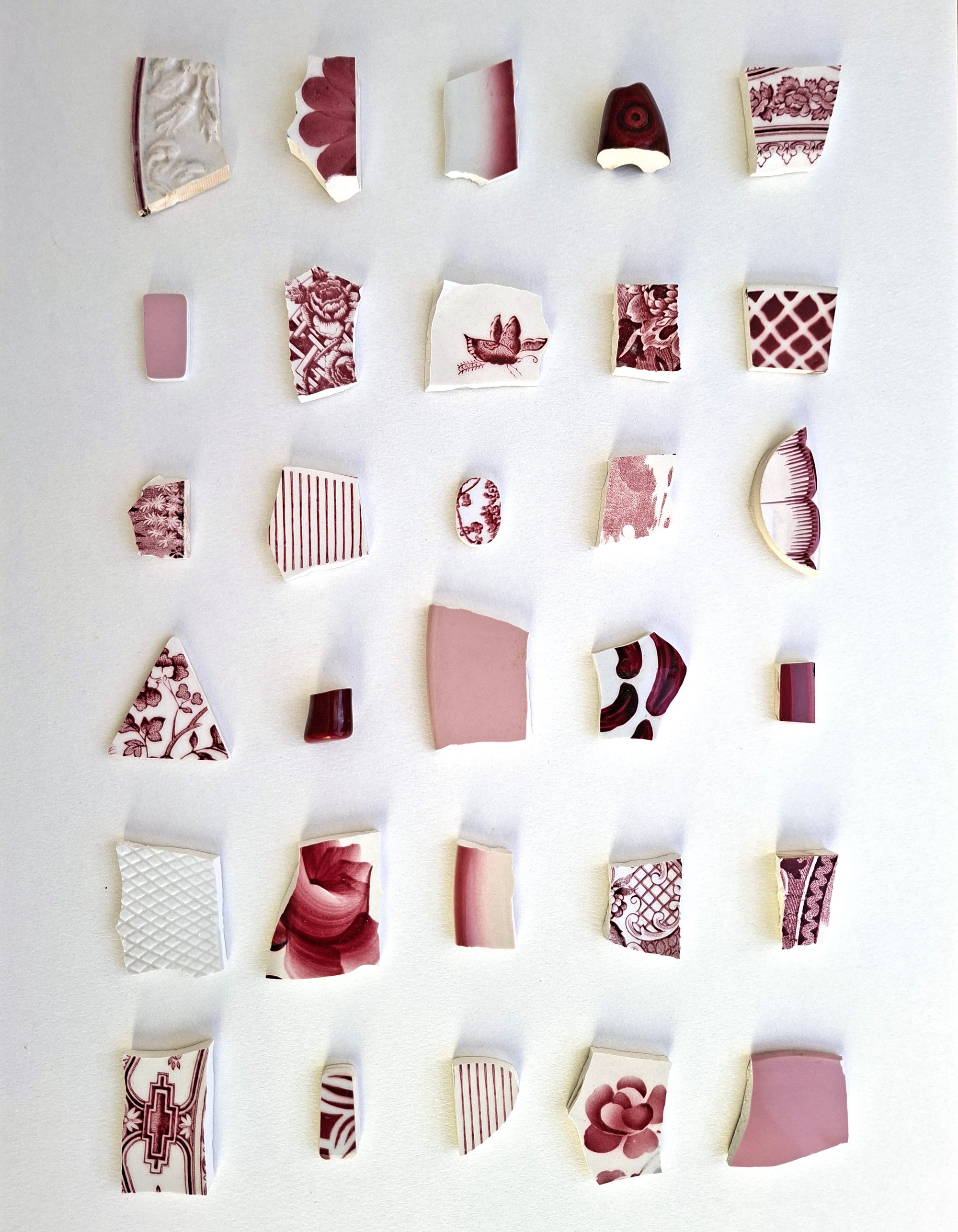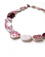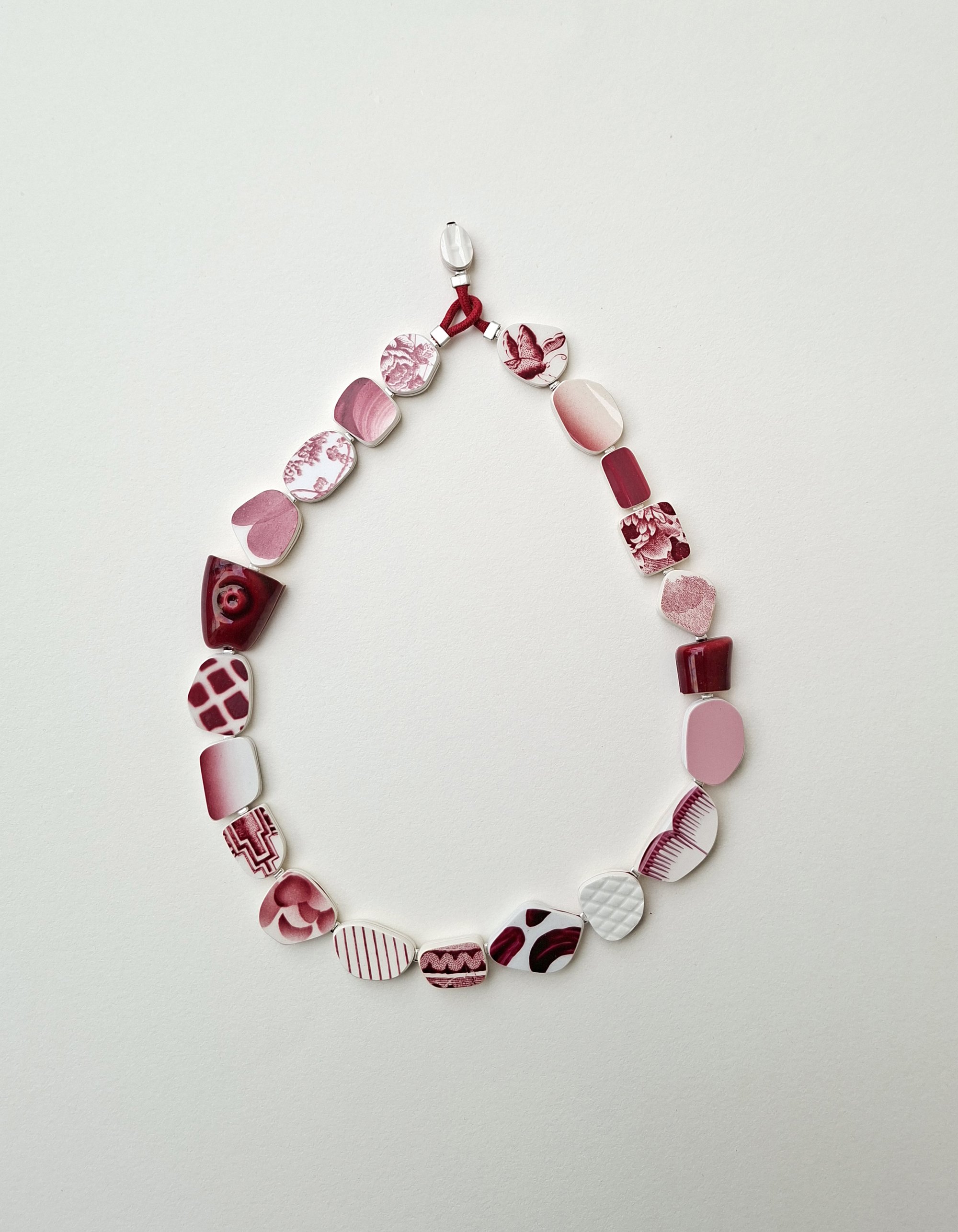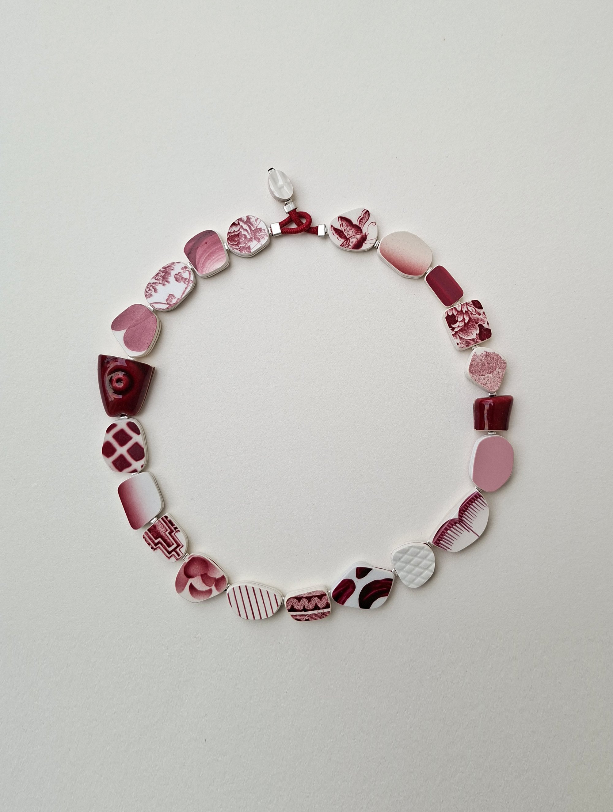 Ce collier a été taillé dans des dizaines d'assiettes en faïence et porcelaine (et un porte couteau Vallauris, le poisson). J'ai puisé dans ma réserve de roses pour en extraire des fragments doux comme des bonbons acidulés.